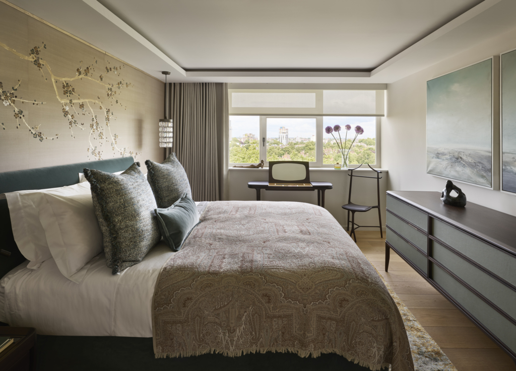 Belgravia Gallery brought a selection of works to view in situ. Two landscapes by Dion Salvador Lloyd were chosen: the British artist’s soft palette and sense of arrested stillness create an atmosphere of calm that sits naturally within a room designed for rest. Alongside them, a signed lithograph – Girl by Charlie Mackesy – brings a different quality: more intimate, more contemporary, and in conversation with the landscapes in a way that feels balanced rather than contrived.