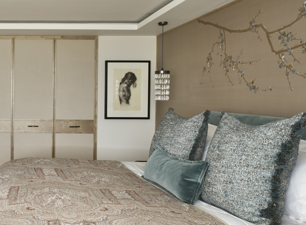 The master bedroom is perhaps the most considered room in the apartment. A silk-embroidered wallcovering from Fromental sets a standard of quiet luxury that the art had to meet without competing.