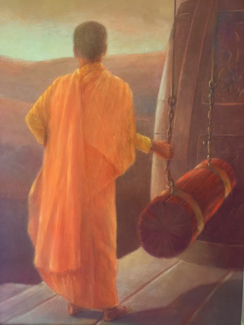 Clifton’s design of the open-plan reception incorporates a study-meditation area, a zone defined not by walls but by intent. For this corner, Belgravia Gallery brought forward Young Monk by Lincoln Seligman, an artist with deep ties to India whose work carries a spiritual sensitivity that aligned naturally with how the space had been conceived. The painting’s palette, gentle ochres and warm earth tones, introduces colour into the space that is otherwise deliberately neutral. Its placement alongside the stone niches, arranged to form the Saptarishi constellation, draws together meditation, yoga, and spiritual practice into something quietly cohesive. The fit felt less like curation and more like fate.