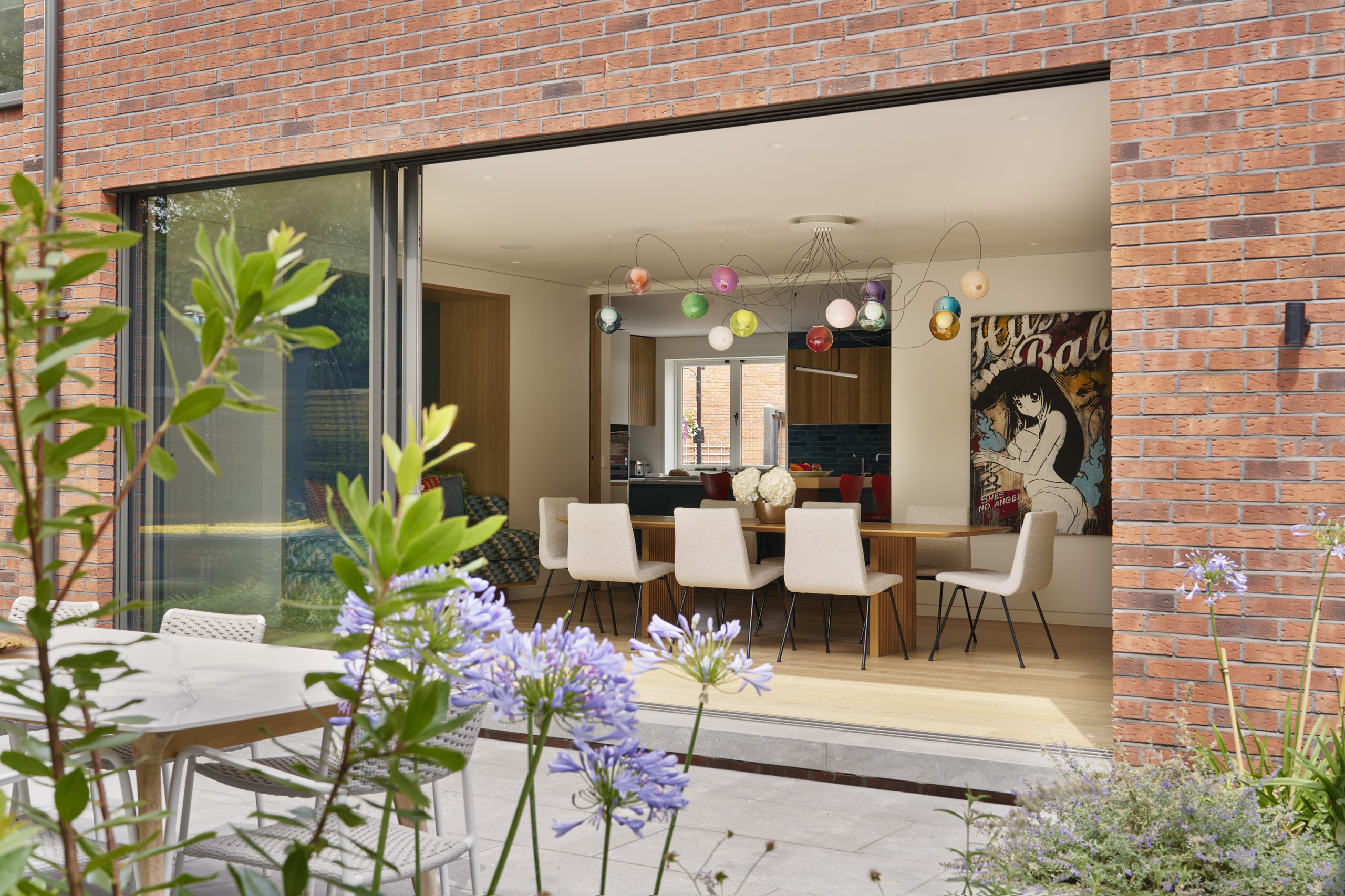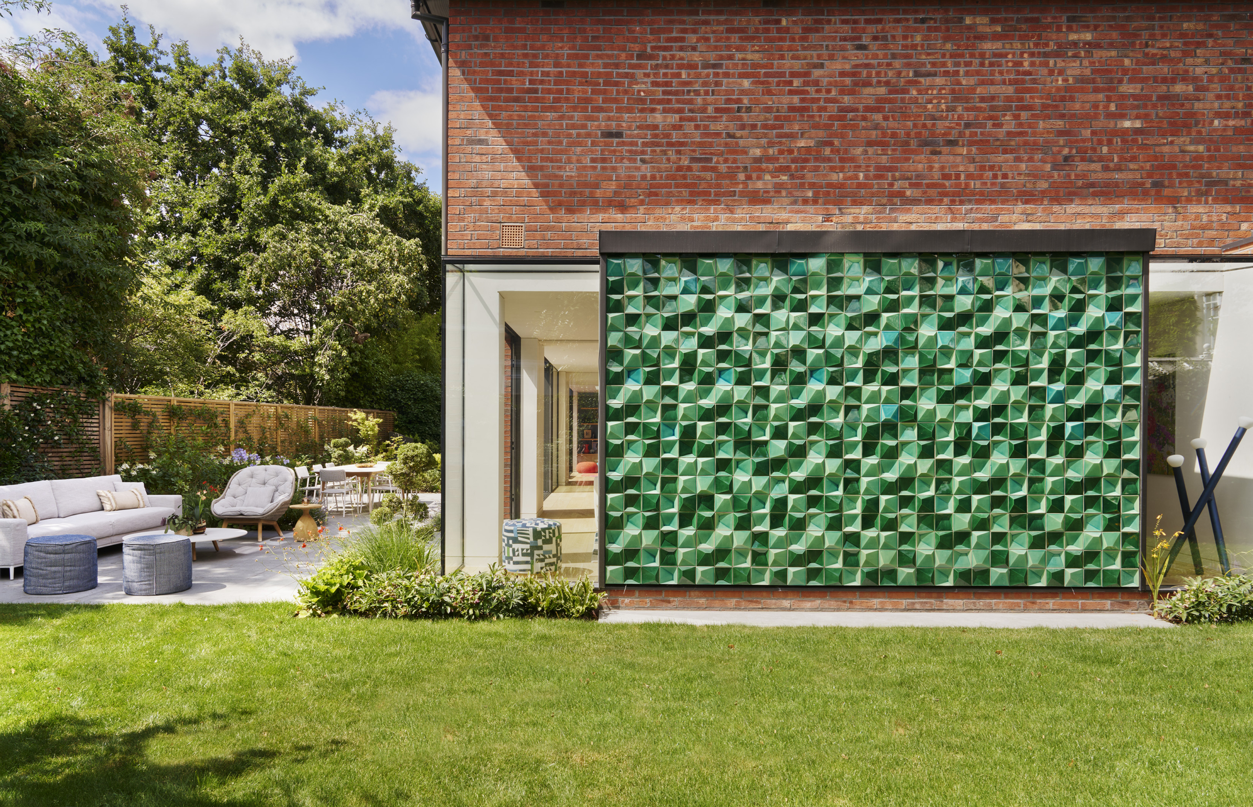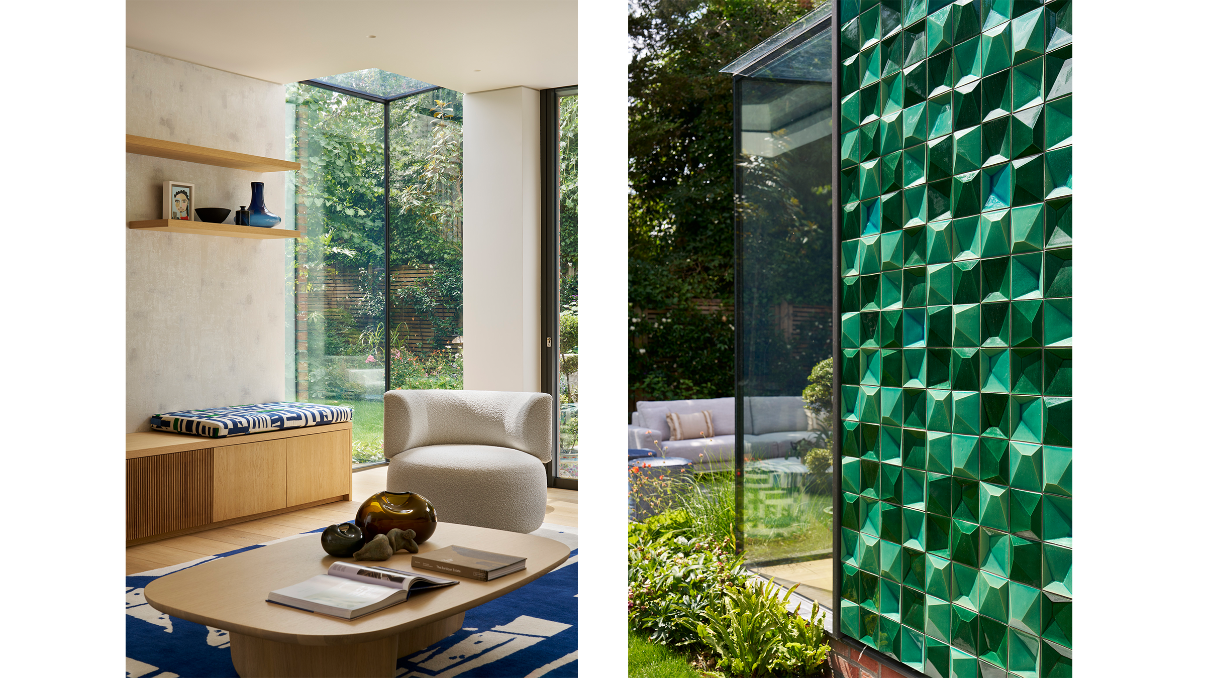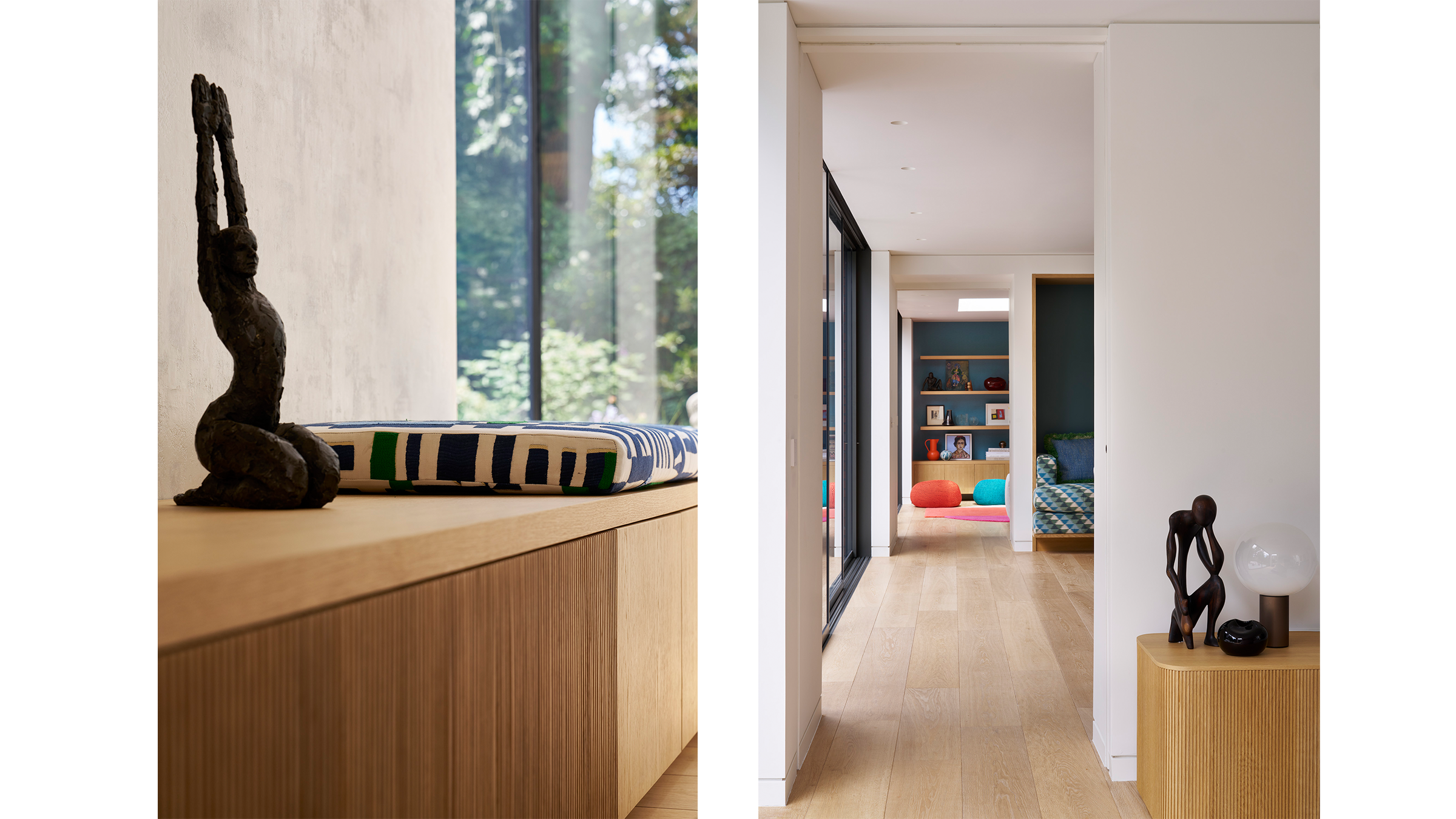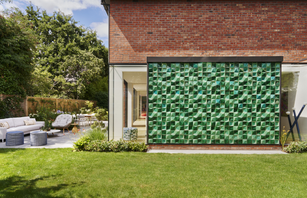 A neutral palette and natural materials establish warmth and calmness, with colour introduced through tactile soft furnishings, layered textures, expressive joinery, and lighting. Outside, a playful tiled feature wall captures the youthful, spirited character that runs throughout the house.