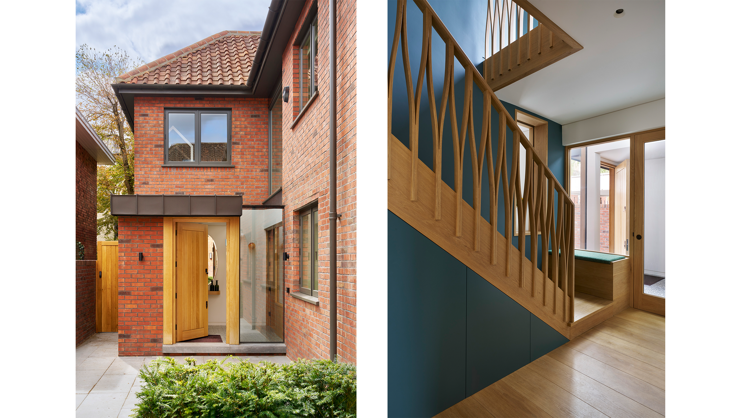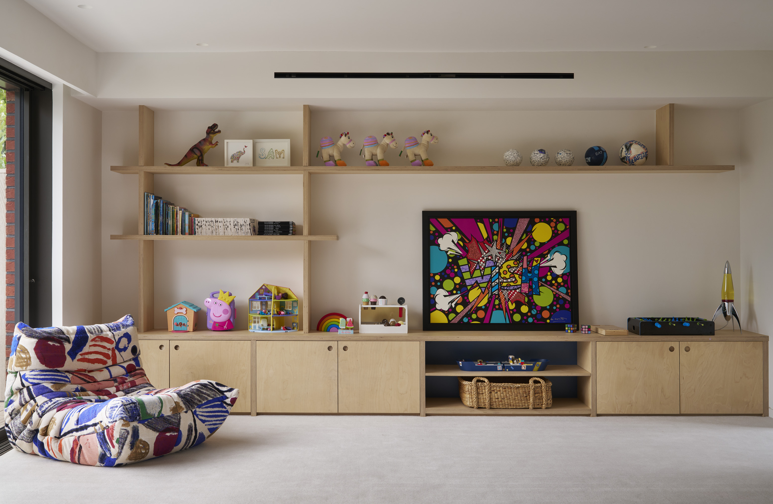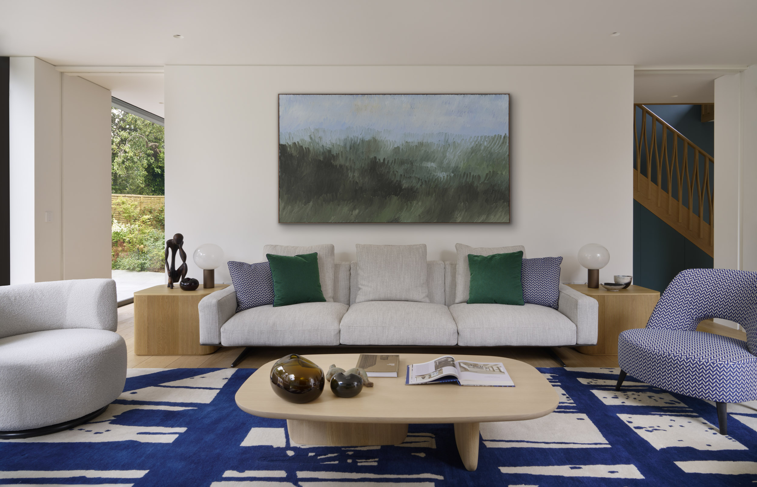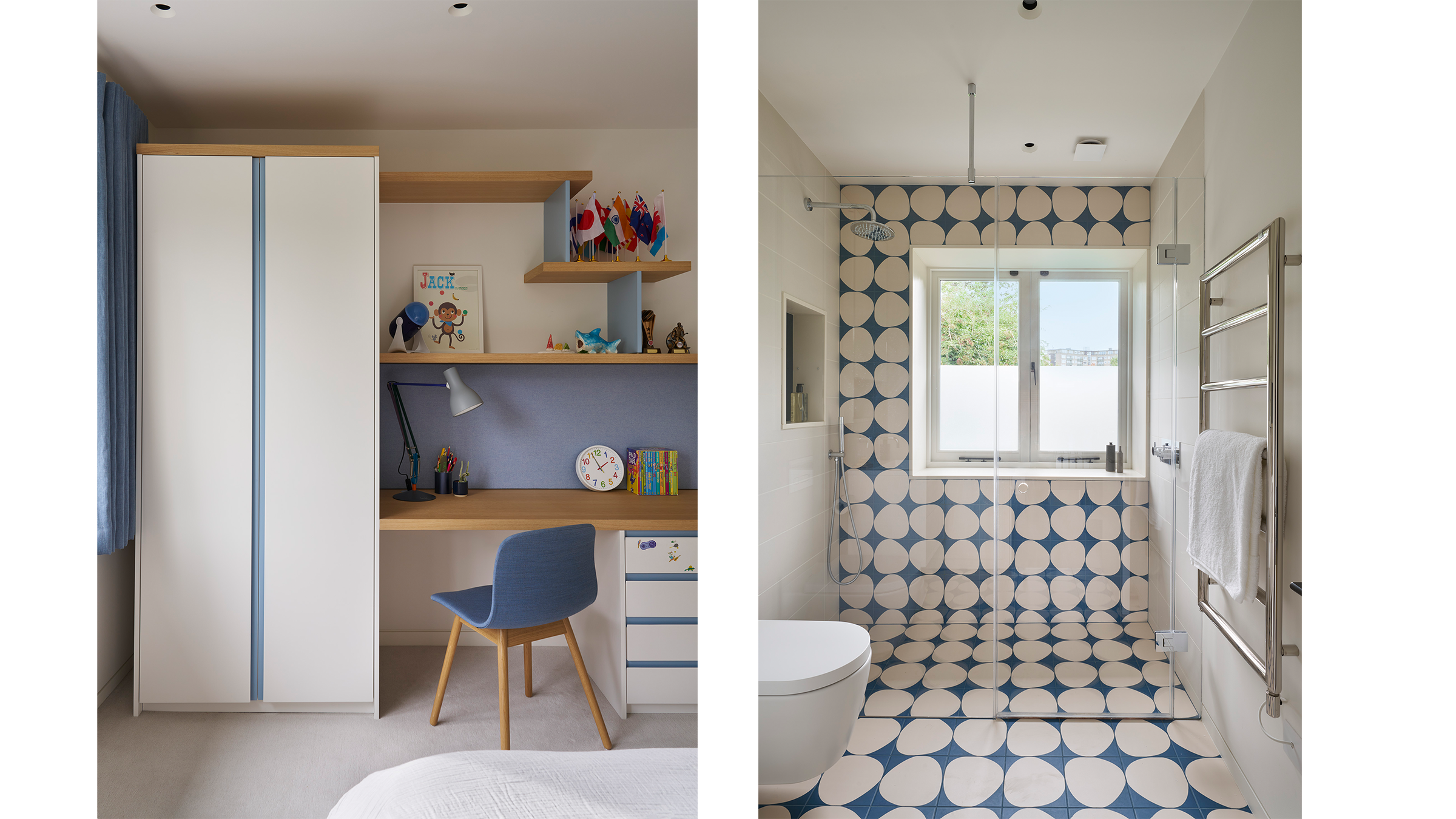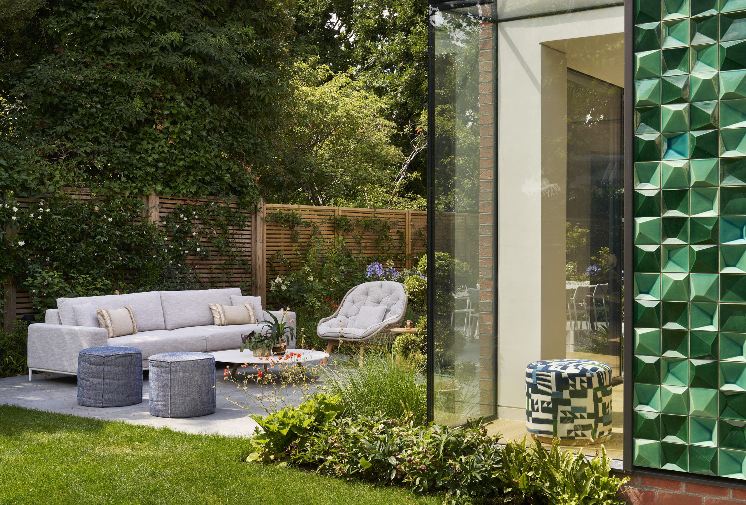 A neutral palette and natural materials establish warmth and calmness, with colour introduced through tactile soft furnishings, layered textures, expressive joinery, and lighting. Outside, a playful tiled feature wall captures the youthful, spirited character that runs throughout the house.