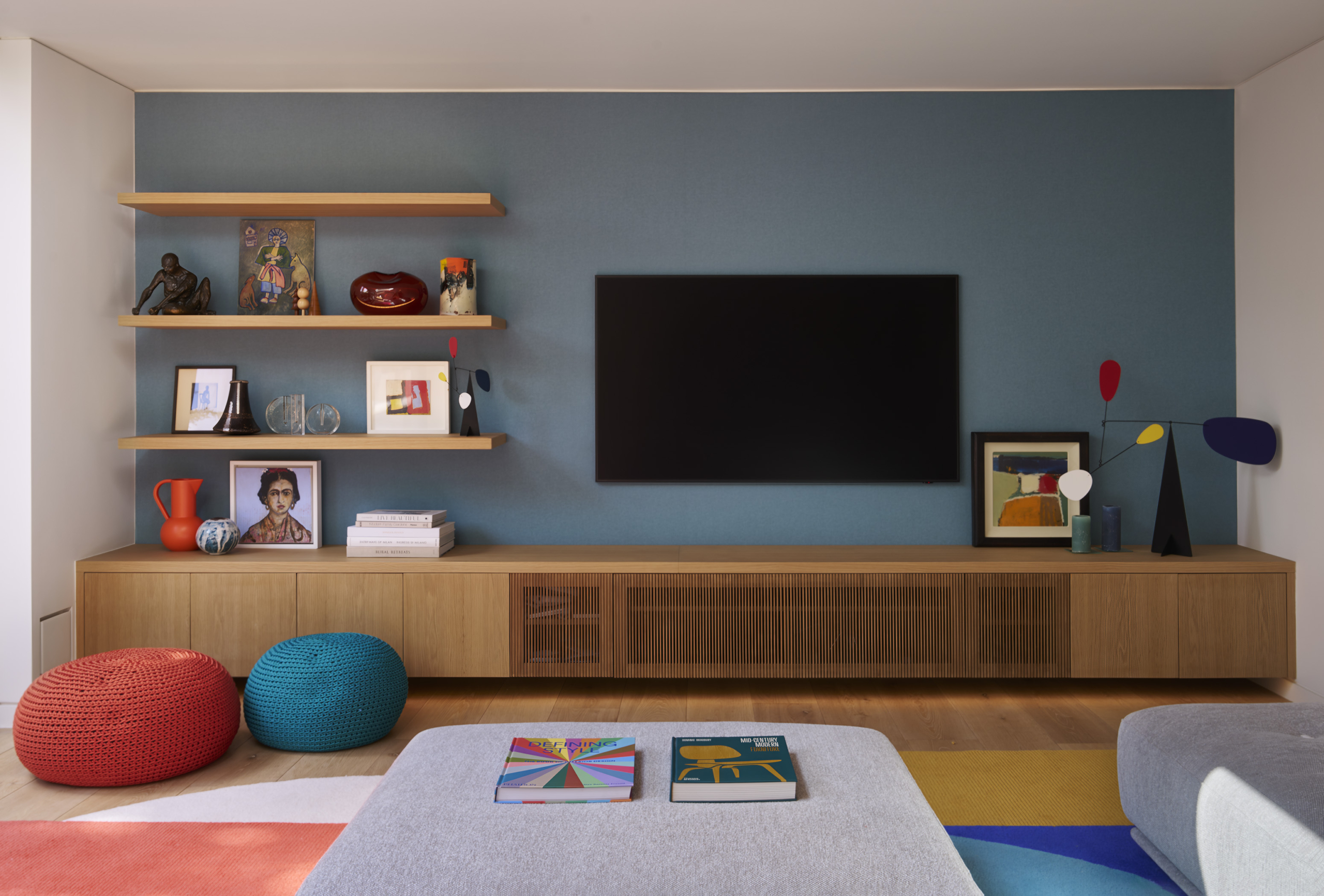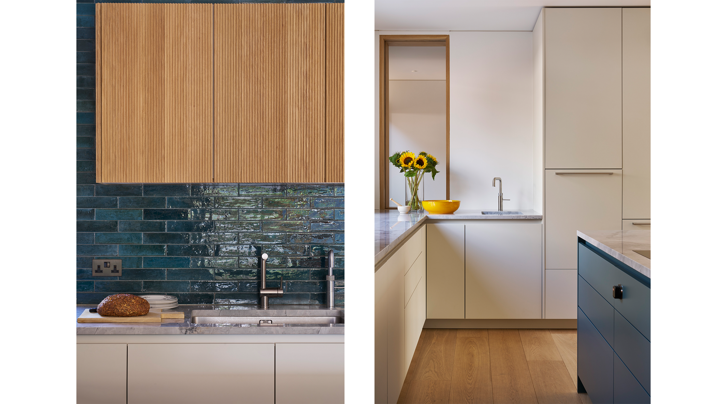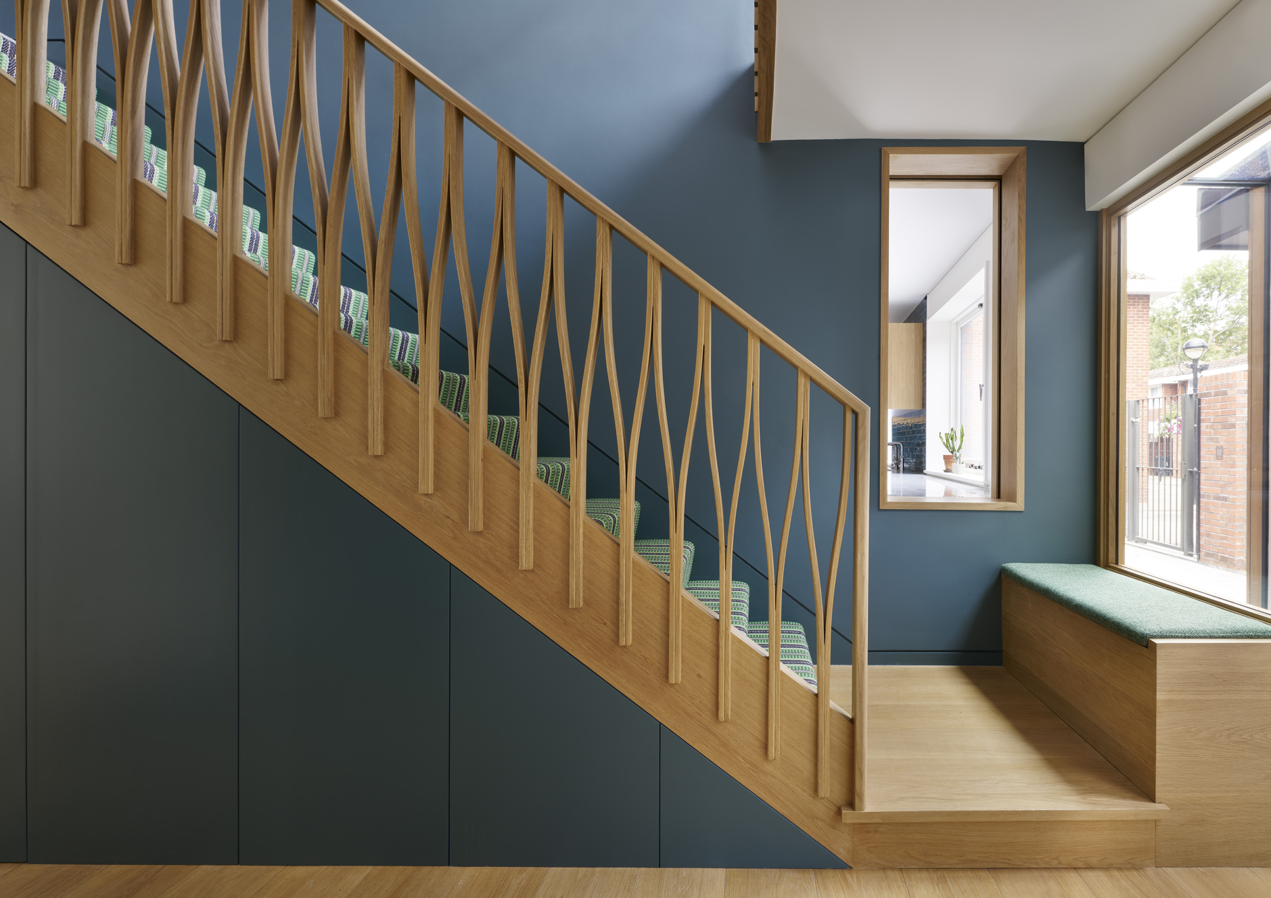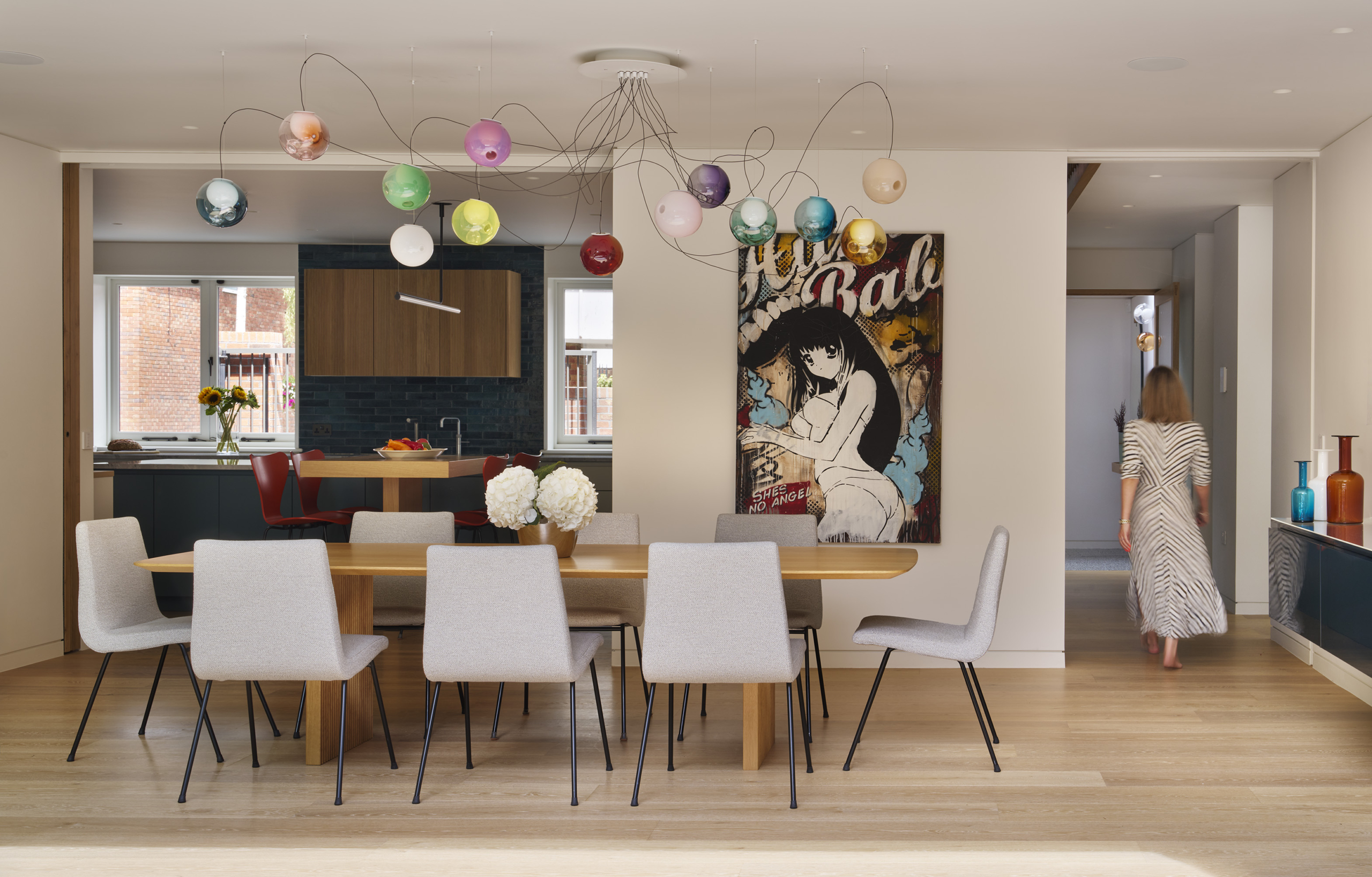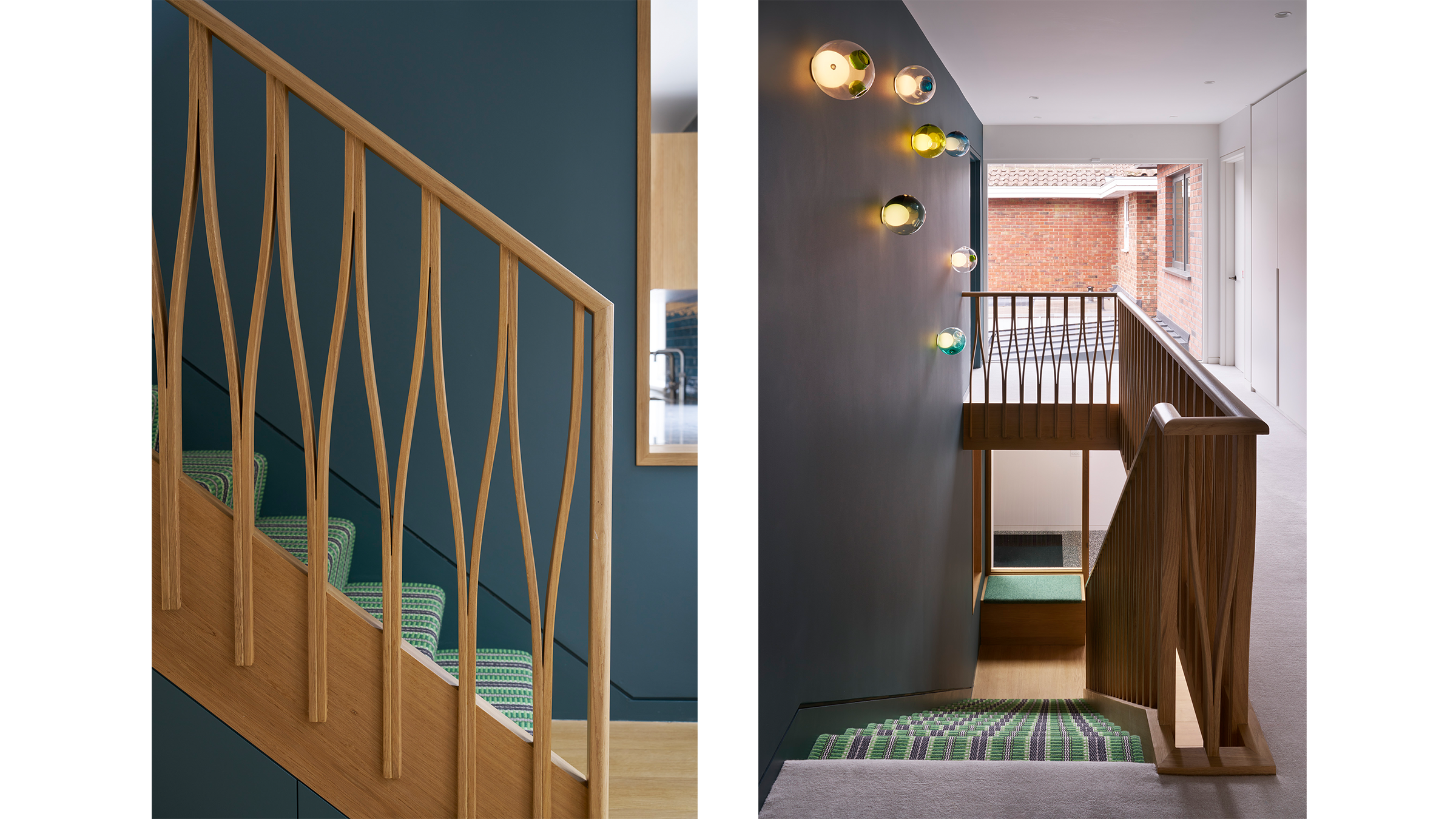 A neutral palette and natural materials establish warmth and calmness, with colour introduced through tactile soft furnishings, layered textures, expressive joinery, and lighting. Outside, a playful tiled feature wall captures the youthful, spirited character that runs throughout the house.