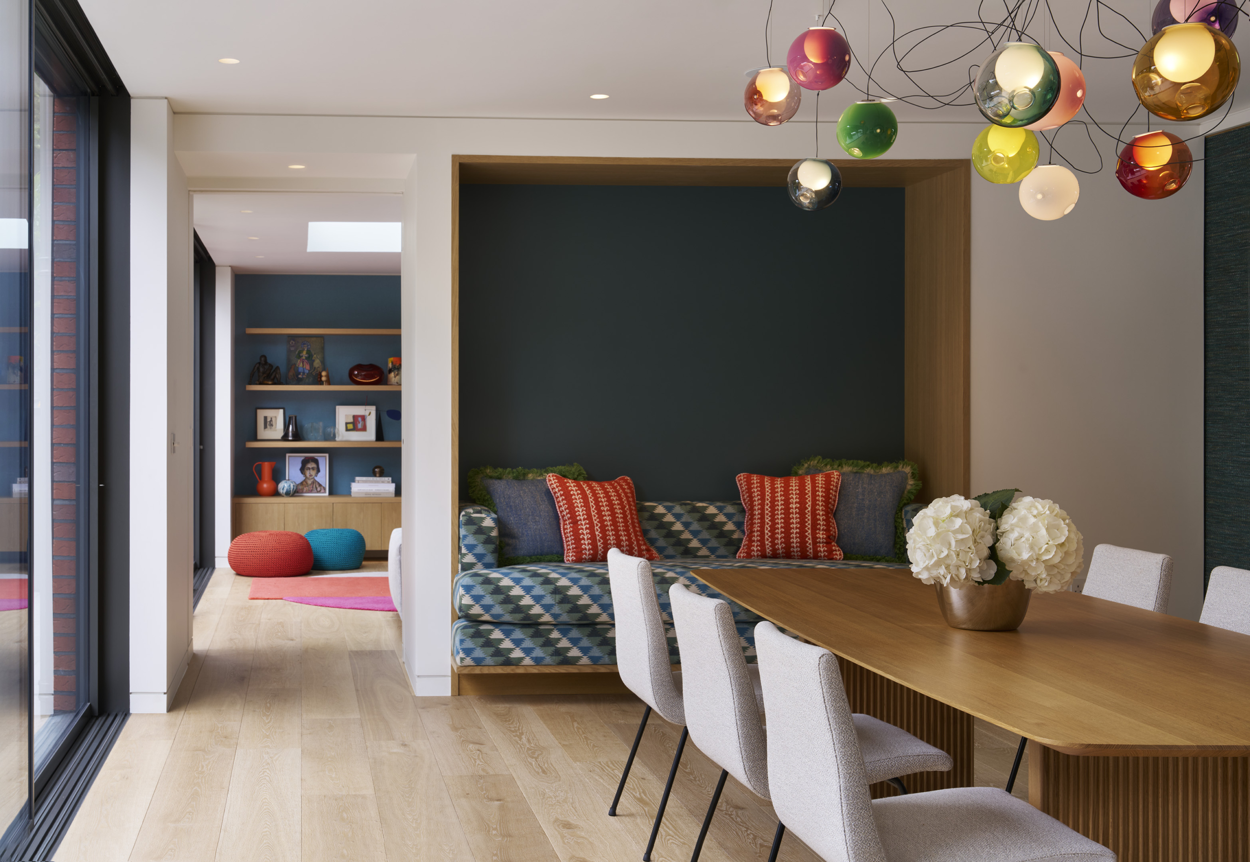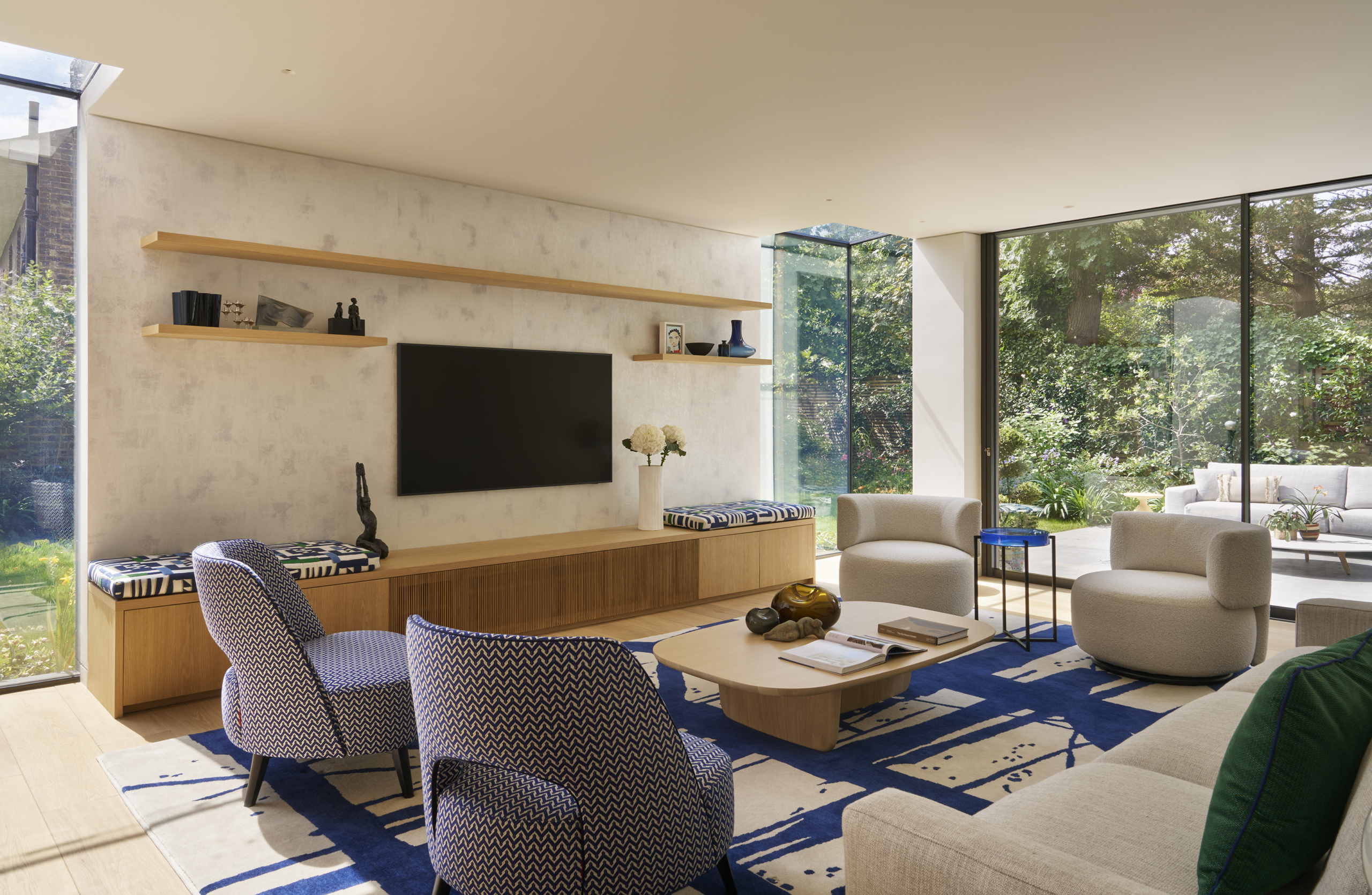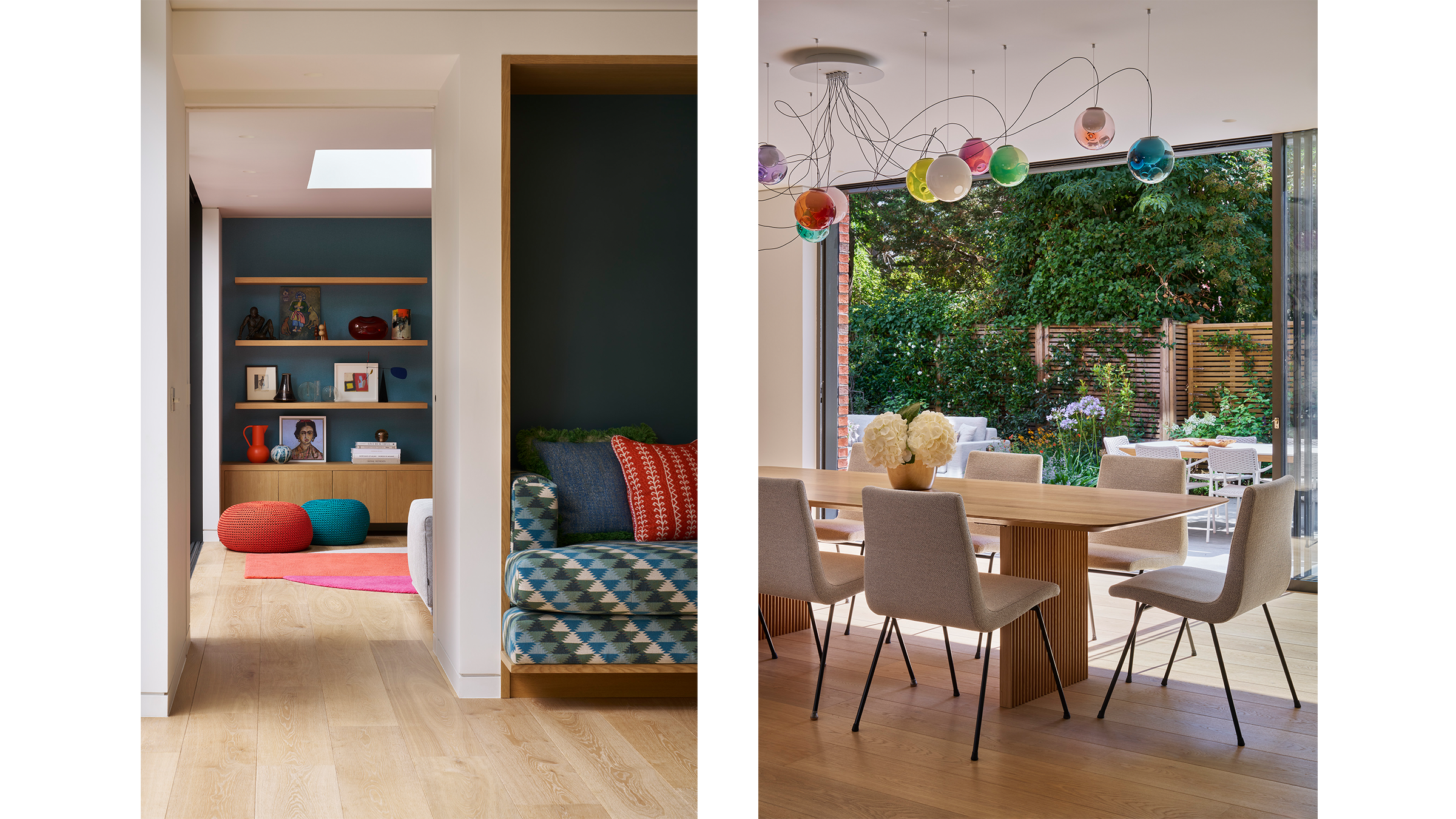 A deceptively simple side extension pushed the living room out by just a metre, but the effect is transformative. This small addition delivered much improved proportions to the room, without sacrificing the adjacent dining area or the hallway’s uninterrupted sightline from the entrance lobby to the garden. Floor-to-ceiling glazing wraps the corner of the extension, adding another interesting perspective of the garden beyond. The bespoke joinery anchors the room, and is flanked by more floor to ceiling glazing, reinforcing a seamless connection between inside and out.