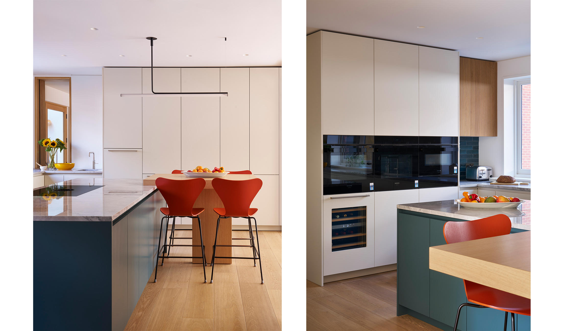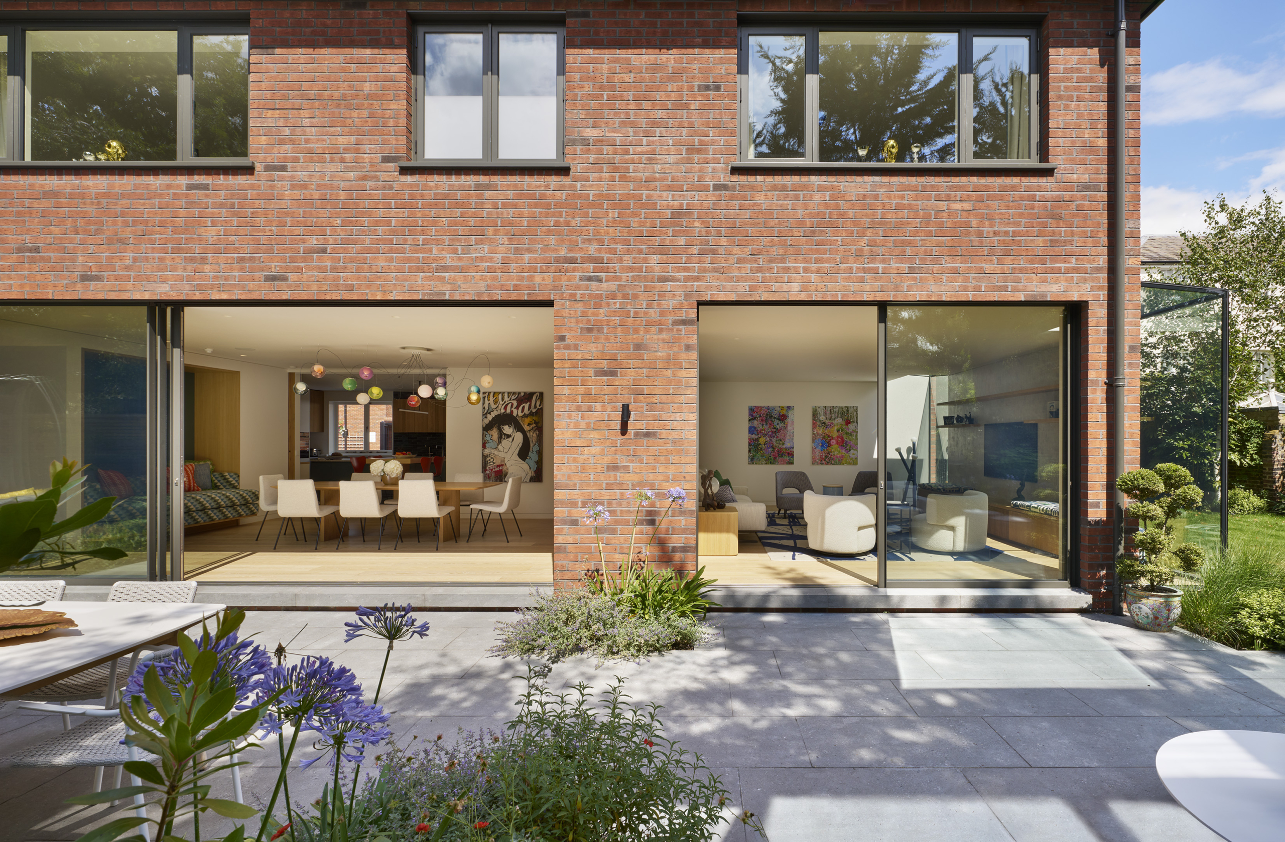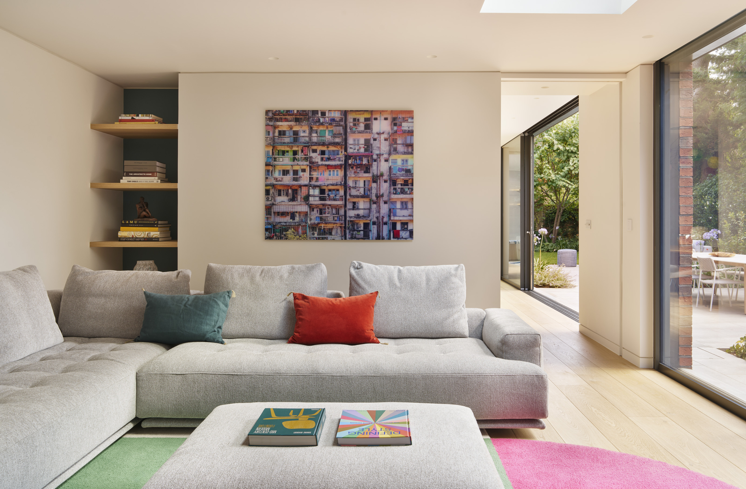 A deceptively simple side extension pushed the living room out by just a metre, but the effect is transformative. This small addition delivered much improved proportions to the room, without sacrificing the adjacent dining area or the hallway’s uninterrupted sightline from the entrance lobby to the garden. Floor-to-ceiling glazing wraps the corner of the extension, adding another interesting perspective of the garden beyond. The bespoke joinery anchors the room, and is flanked by more floor to ceiling glazing, reinforcing a seamless connection between inside and out.